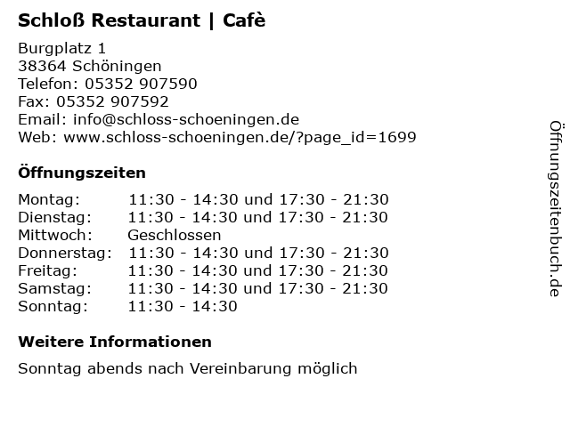 | Öffnungszeiten Schloß Restaurant | Cafè in Schöningen anzeigen | |