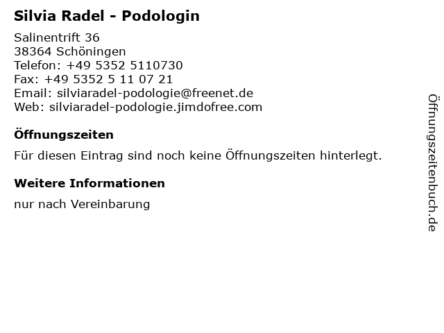 | Öffnungszeiten Silvia Radel - Podologin in Schöningen anzeigen | |