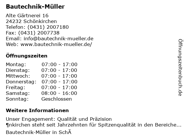 | Öffnungszeiten Bautechnik-Müller in Schönkirchen anzeigen | |