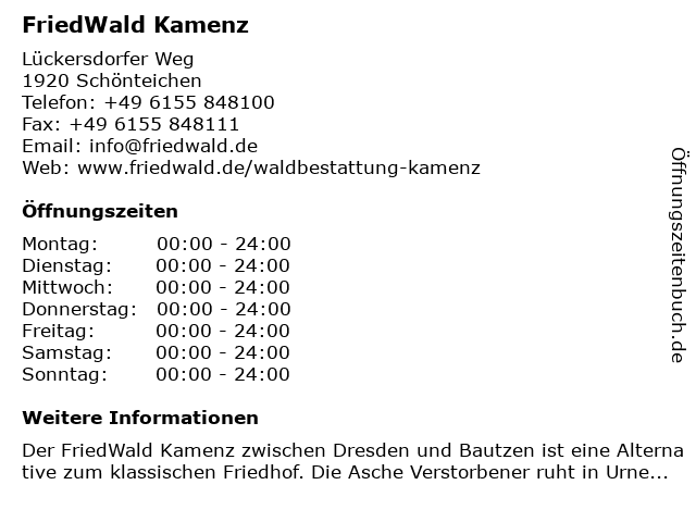 | Öffnungszeiten FriedWald Kamenz in Schönteichen anzeigen | |