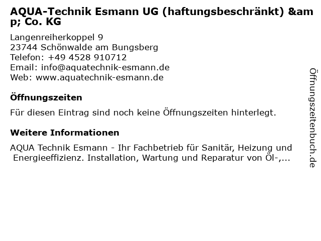 | AQUA-Technik Esmann UG (haftungsbeschränkt) & Co. KG anrufen | |