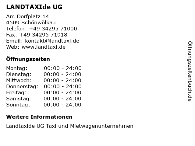 | Öffnungszeiten LANDTAXIde UG in Schönwölkau anzeigen | |