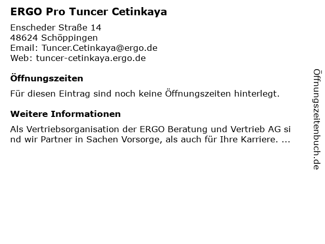 | Öffnungszeiten ERGO Pro Tuncer Cetinkaya in Schöppingen anzeigen | |