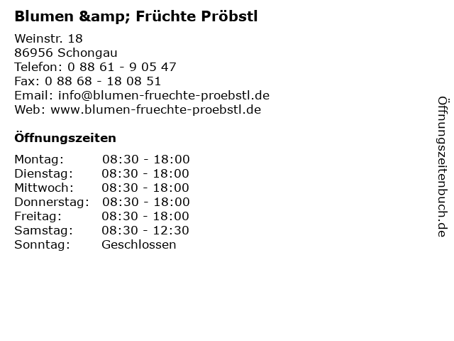 | Öffnungszeiten Blumen & Früchte Pröbstl in Schongau anzeigen | |