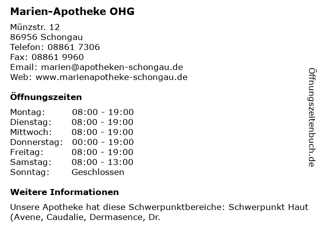 | Öffnungszeiten Marien-Apotheke OHG in Schongau anzeigen | |