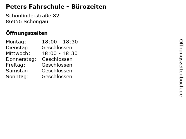 | Öffnungszeiten Peters Fahrschule - Bürozeiten in Schongau anzeigen | |