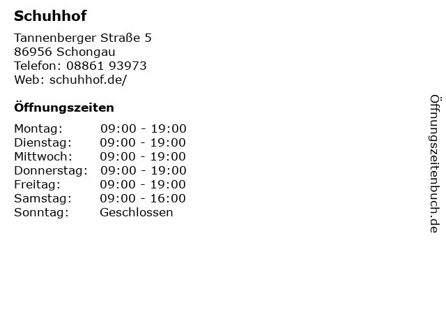 | Öffnungszeiten Schuhhof in Schongau anzeigen | |
