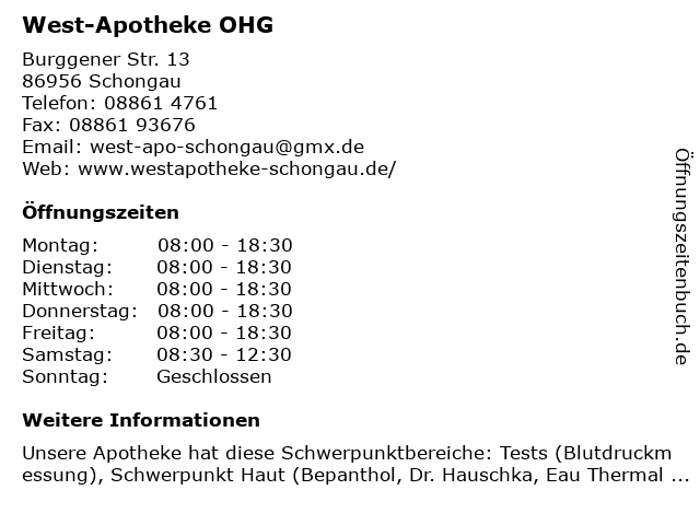 | Öffnungszeiten West-Apotheke OHG in Schongau anzeigen | |