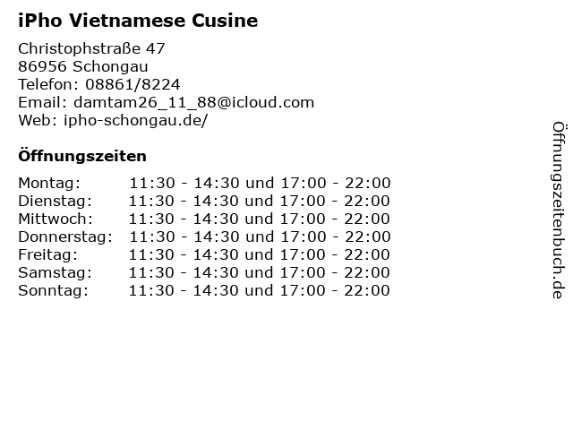 | Öffnungszeiten iPho Vietnamese Cusine in Schongau anzeigen | |