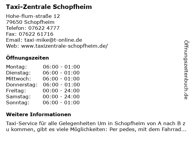 | Öffnungszeiten Taxi-Zentrale Schopfheim in Schopfheim anzeigen | |