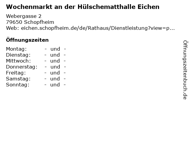 | Öffnungszeiten Wochenmarkt an der Hülschematthalle Eichen in Schopfheim anzeigen | |