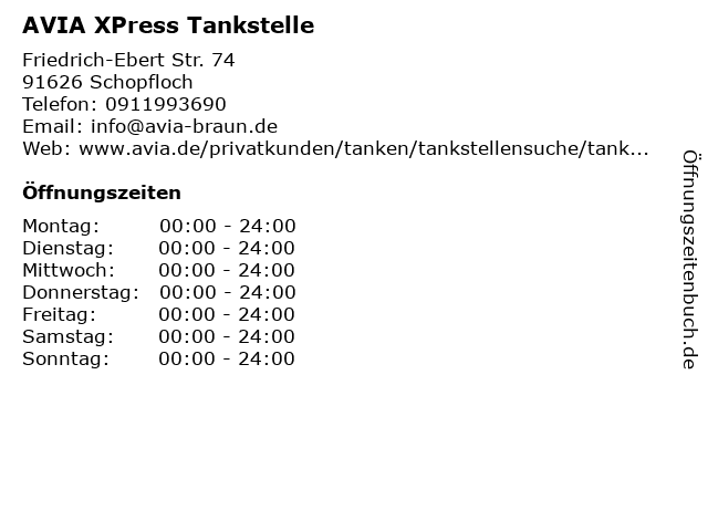 | Öffnungszeiten AVIA XPress Tankstelle in Schopfloch anzeigen | |
