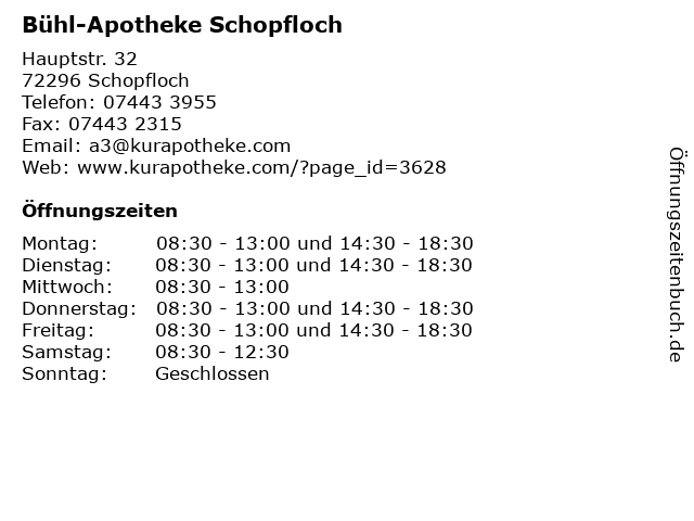 | Öffnungszeiten Bühl-Apotheke Schopfloch in Schopfloch anzeigen | |