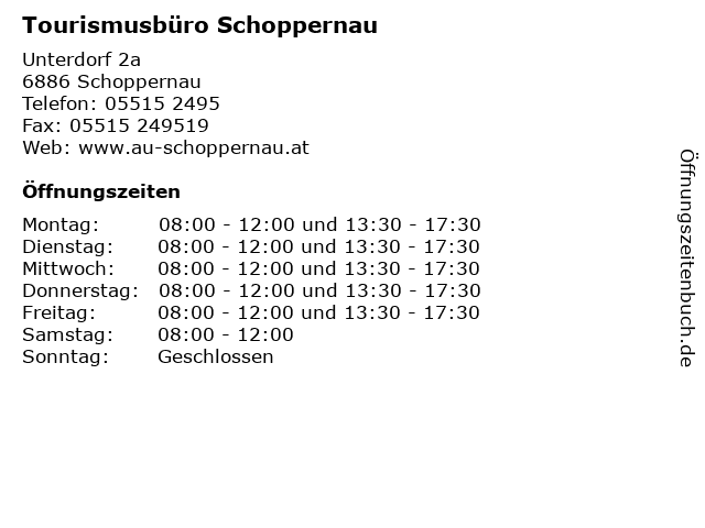 | Öffnungszeiten Tourismusbüro Schoppernau in Schoppernau anzeigen | |