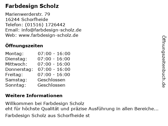 | Öffnungszeiten Farbdesign Scholz in Schorfheide anzeigen | |