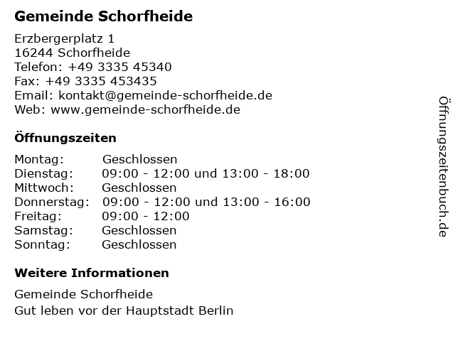 | Öffnungszeiten Gemeinde Schorfheide in Schorfheide anzeigen | |