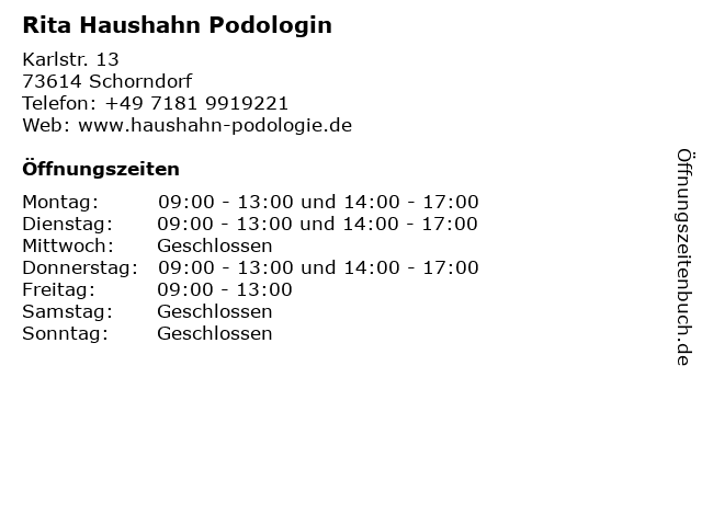 | Öffnungszeiten Rita Haushahn Podologin in Schorndorf anzeigen | |