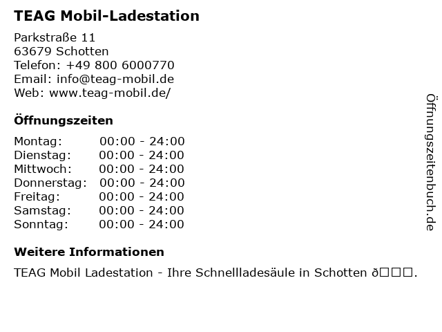 | Öffnungszeiten TEAG Mobil-Ladestation in Schotten anzeigen | |