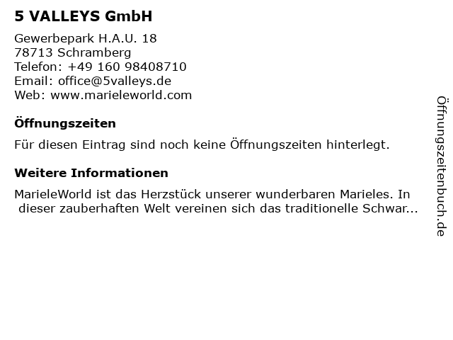| Öffnungszeiten 5 VALLEYS GmbH in Schramberg anzeigen | |