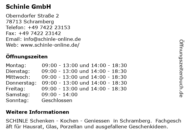 | Öffnungszeiten Schinle GmbH in Schramberg anzeigen | |