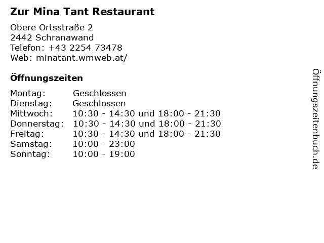 | Öffnungszeiten Zur Mina Tant Restaurant in Schranawand anzeigen | |
