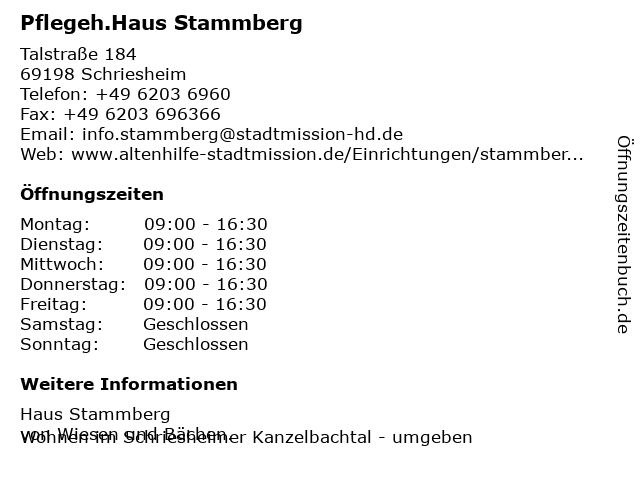 | Öffnungszeiten Pflegeh.Haus Stammberg in Schriesheim anzeigen | |