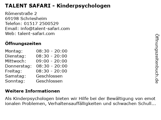 | 1 TALENT SAFARI - Kinderpsychologen - Dr. Katharina und Tom Reschke GbR (Entfernung: 0,68 km) Schelmengrubweg 27, 69198 Schriesheim 6 |