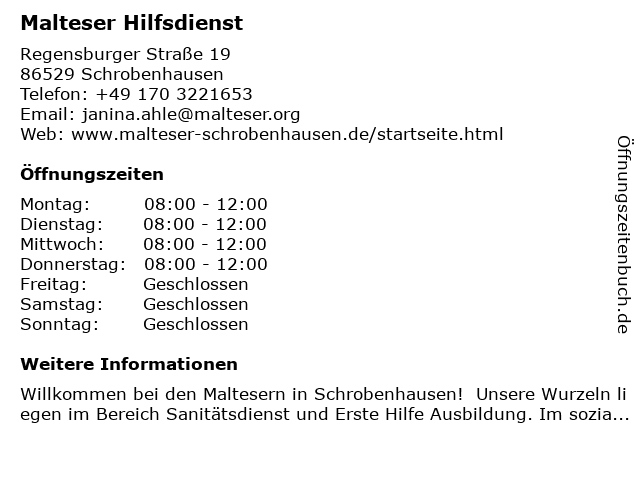 | Öffnungszeiten Malteser Hilfsdienst in Schrobenhausen anzeigen | |