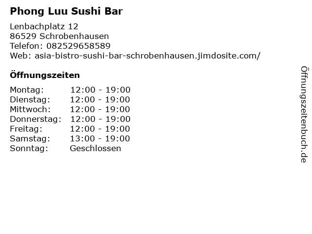 | Öffnungszeiten Phong Luu Sushi Bar in Schrobenhausen anzeigen | |