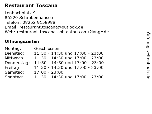 | Öffnungszeiten Restaurant Toscana in Schrobenhausen anzeigen | |