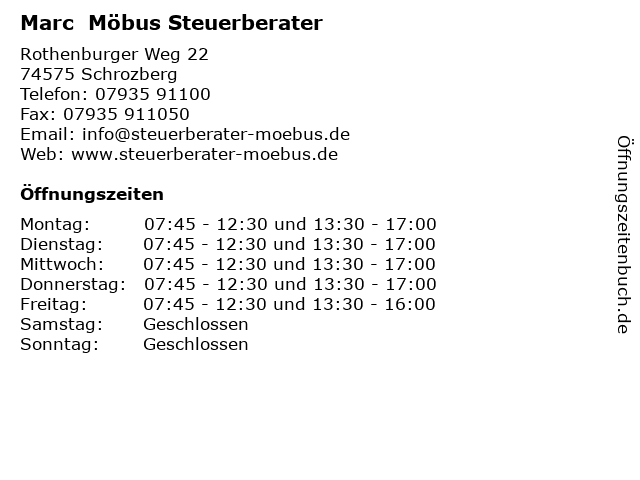 Öffnungszeiten Marc Möbus Steuerberater in Schrozberg anzeigen | |