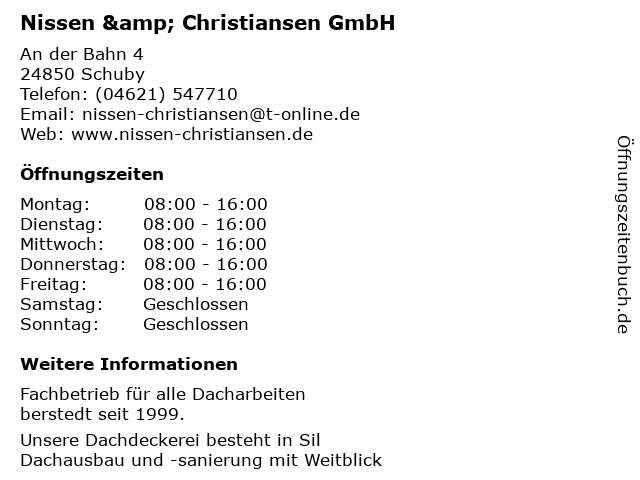 | Öffnungszeiten Nissen & Christiansen GmbH in Schuby anzeigen | |