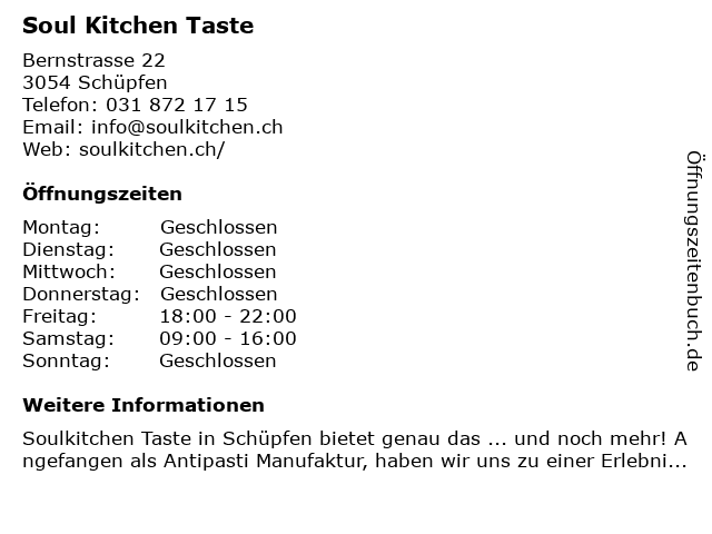 | Öffnungszeiten Soul Kitchen Taste in Schüpfen anzeigen | |