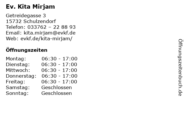 | Öffnungszeiten Ev. Kita Mirjam in Schulzendorf anzeigen | |