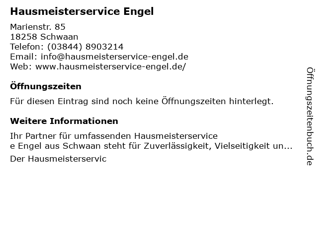 | Öffnungszeiten Hausmeisterservice Engel in Schwaan anzeigen | |