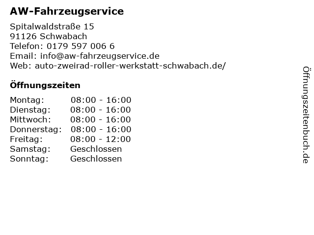 | Öffnungszeiten AW-Fahrzeugservice in Schwabach anzeigen | |
