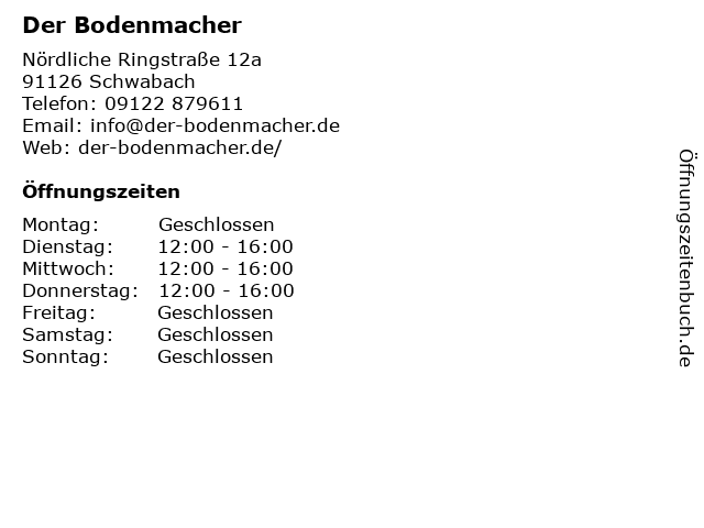 | Öffnungszeiten Der Bodenmacher in Schwabach anzeigen | |