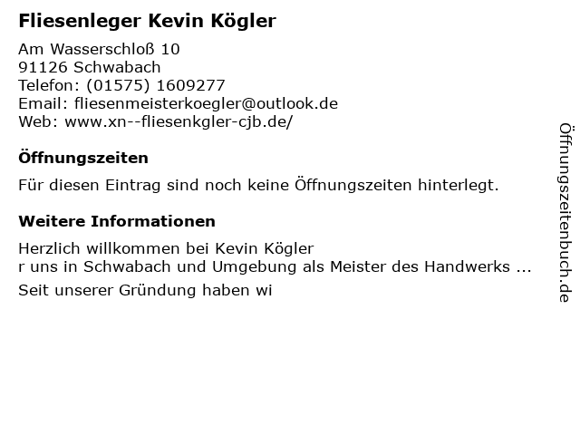 | Öffnungszeiten Fliesenleger Kevin Kögler in Schwabach anzeigen | |