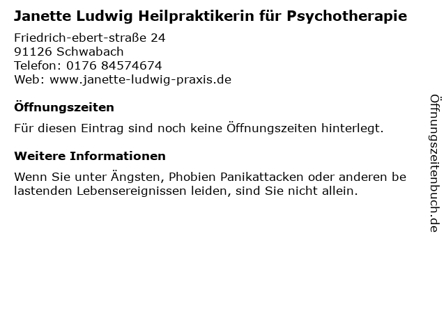 | Janette Ludwig Heilpraktikerin für Psychotherapie anrufen | |