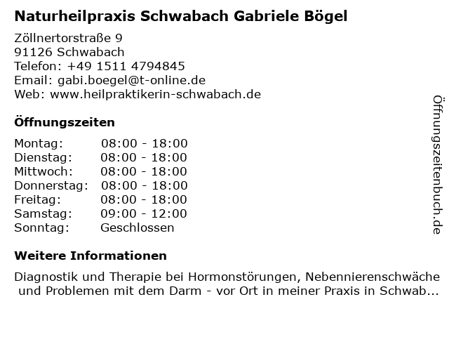 1 BINETIQ - Naturheilpraxis für osteopathische Biodynamik, Frank LAUER (Entfernung: 0,04 km) Zöllnertorstr. 12, 91126 Schwabach 4 Fußpflegepraxis-Podologie Gabriele Tilouine (Entfernung: 0,52 km) Nördliche Ringstr. 1, 91126 Schwabach 5 Dr. Friedemann Schaefer Gabriele Tempelmeier Tierärzte (Entfernung: 0,57 km) Rupprechtstr 2, 91126 Schwabach 6 |