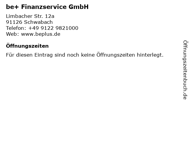 | Öffnungszeiten be+ Finanzservice GmbH in Schwabach anzeigen | |