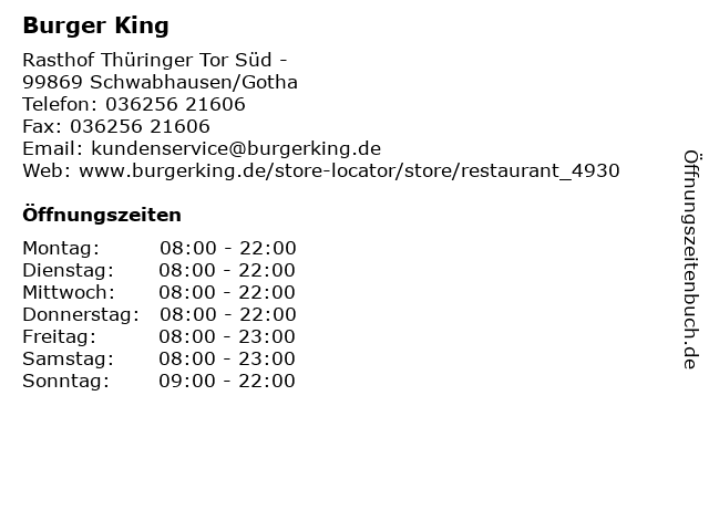 | Öffnungszeiten Burger King in Schwabhausen/Gotha anzeigen | |