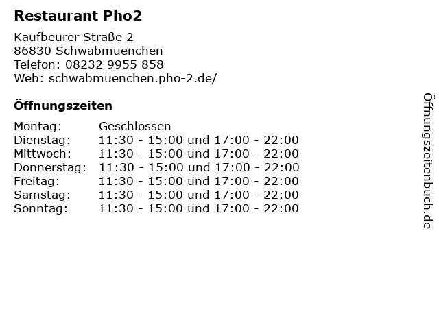 | Öffnungszeiten Restaurant Pho2 in Schwabmuenchen anzeigen | |