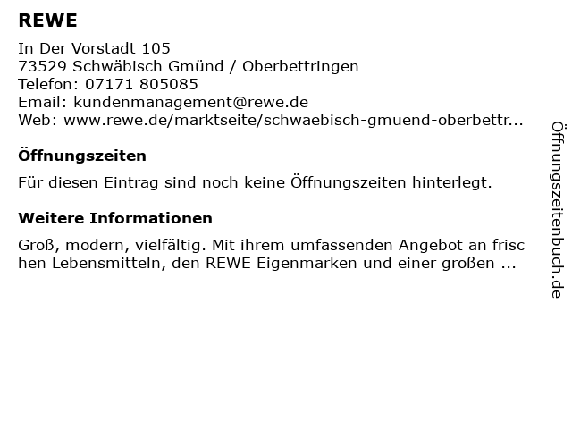 Hinweis: Groß, modern, vielfältig. Mit ihrem umfassenden Angebot an frischen Lebensmitteln, den REWE Eigenmarken und einer großen Getränkeauswahl, bieten REWE Supermärkte alles was Sie brauchen an einem Ort.