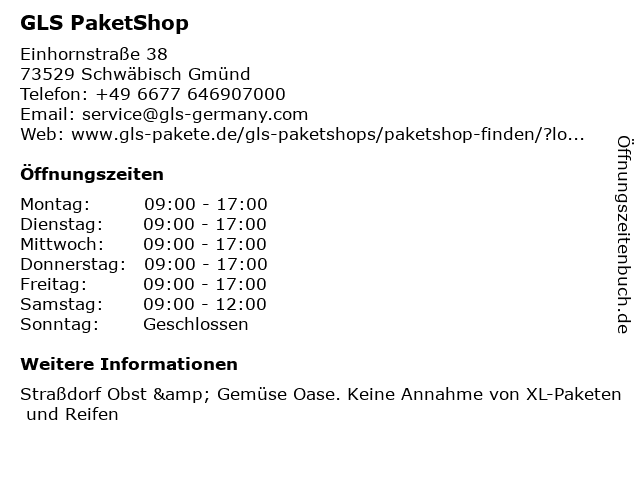 | Öffnungszeiten GLS PaketShop in Schwäbisch Gmünd anzeigen | |