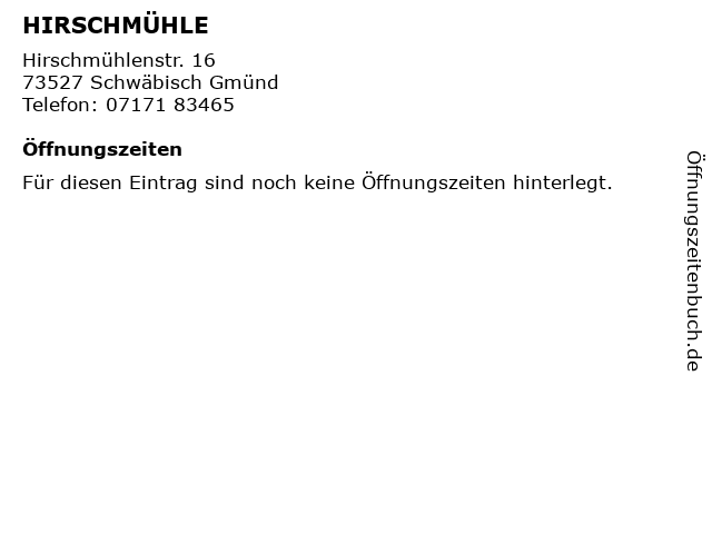 | Öffnungszeiten HIRSCHMÜHLE in Schwäbisch Gmünd anzeigen | |