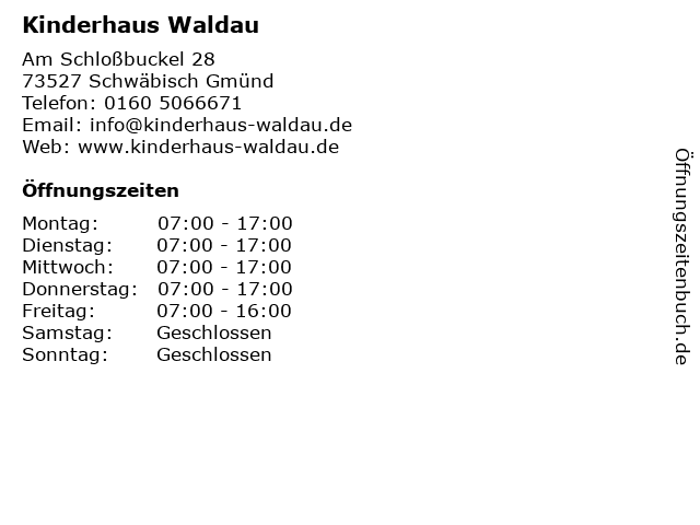 | Öffnungszeiten Kinderhaus Waldau in Schwäbisch Gmünd anzeigen | |