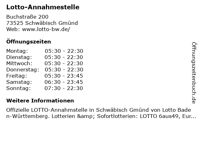 | Öffnungszeiten Lotto-Annahmestelle in Schwäbisch Gmünd anzeigen | |