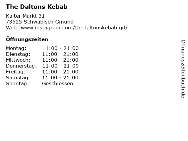 | Öffnungszeiten The Daltons Kebab in Schwäbisch Gmünd anzeigen | |