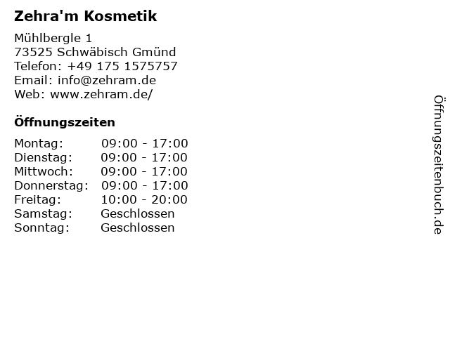 | Öffnungszeiten Zehra'm Kosmetik in Schwäbisch Gmünd anzeigen | |